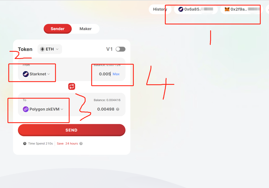首先我们链接好钱包,由于stark与eth不互通,需要链接两个钱包,其他网络一个就可以了,如op,arb,主网,zksync等。选择好网络,输入跨链金额,然后点击发送即可。