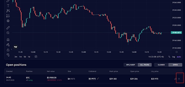 2.然后平仓,先点击下面x的标志,然后出现下图,点击closelongbtc平仓