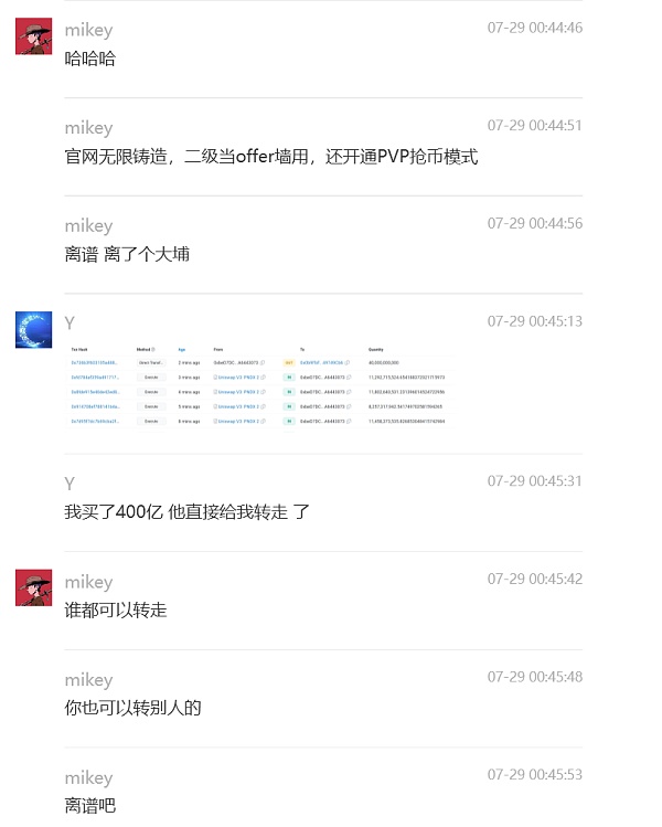 更夸张的是可以通过合约函数转移别人的币,目前的情况就是网站一级不断铸币二级不懂的人不断接盘,二级同时开启了PVP抢币模式,目前据悉土狗最强夹子机器人ae13已亏损50wu,刚夹一半被人转走了。