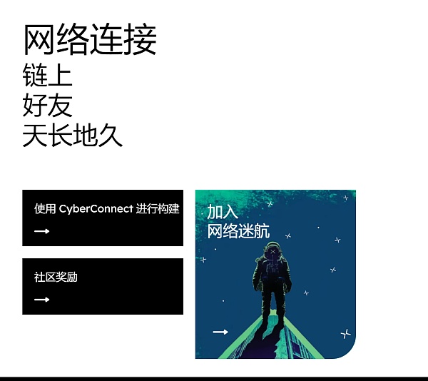 CyberConnect 是一个去中心化社交图谱协议,它使开发者能够创建社交应用程序,使用户能够拥有自己的数字身份、内容、连接和货币化渠道。它由三个以用户为中心的功能组成:CyberProfile,一个提供 web3 访问的去中心化身份标准;以及 CyberConnect 社交图谱,它将用户的数字身份、数据、内容和朋友联系起来;以及CyberWallet,这是一款智能合约钱包,可提供轻松的web3社交体验。