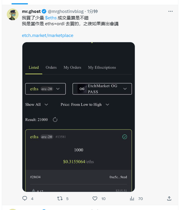 目前erc20交易代币网站已经出来了,可以自由购买了,目前整个市场刚刚起步,未来无限可能,至少可以看见ordi的样子,上线平台后ordi快速上涨,直接冲到了10刀附近,然后快速回调到4刀附近,然后上线gate拉到30刀,eths会不会也在短时间实现这一切,目前代币,域名,NFT等内容已经上线了,layer2未来也会上线,本人是非常看好这个赛道的,在以太坊这列火车上,起飞很容易,有足够的用户与资金,我们唯一可以做的就是拿住手中的筹码,不要卖飞了。川少也是说了,未来eths的市值可能会超过arb+op+ens+punk.....等等市值。