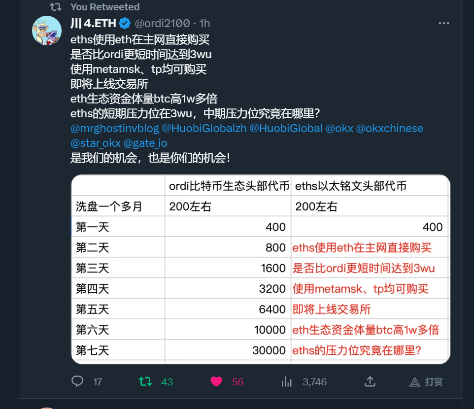 今日ERC20协议第一个代币eths直线拉升,目前网站宕机,宕机前最后交易价格为368u,今天因猴子大佬进场扫货,带动市场fomo,目前受到的关注量,还在不断的攀升,后期上线一线交易所可能性加大,以太坊的基础设施远远好于比特币的,交易成本更低,用户量也足够多,使用方便,可能发展的比比特币铭文更快,oedi早期布道者川少,今日发推,给出eths增长飞轮对比ordi。我们有理由相信这个实验会成功,自下而上的变革,完全由社区推动,未来市场发展潜力巨大,V神都十分关注比特币铭文的发展,关注和助力以太铭文迟早的事。