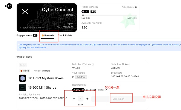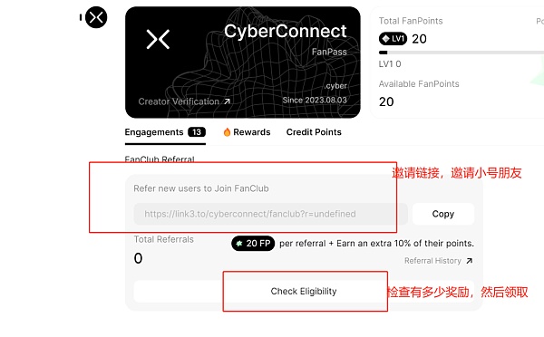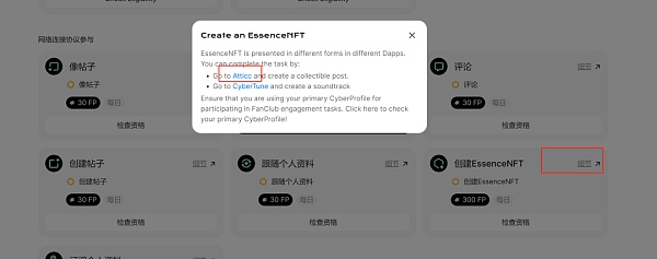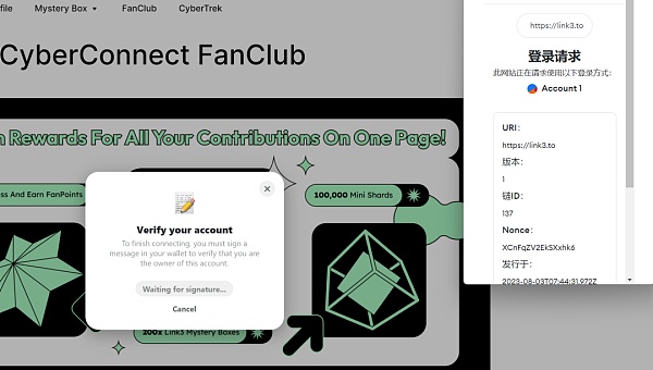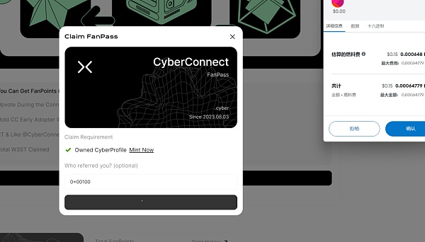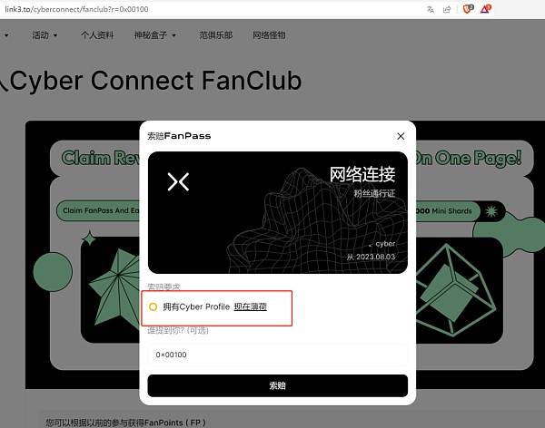 第一步打开链接https://link3.to/cyberconnect/fanclub?r=0x00100 链接钱包