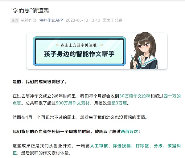 其实,训练AI大模型,“数据盗窃”并非个案。上个月,笔神作文公开指控昔日合作伙伴学而思,认为学而思通过爬虫方式“偷数据”训练自家AI产品。笔神作文表示,将通过司法程序解决纠纷,要求“学而思”支付1元赔偿金,公开道歉,并删除已爬取的数据。