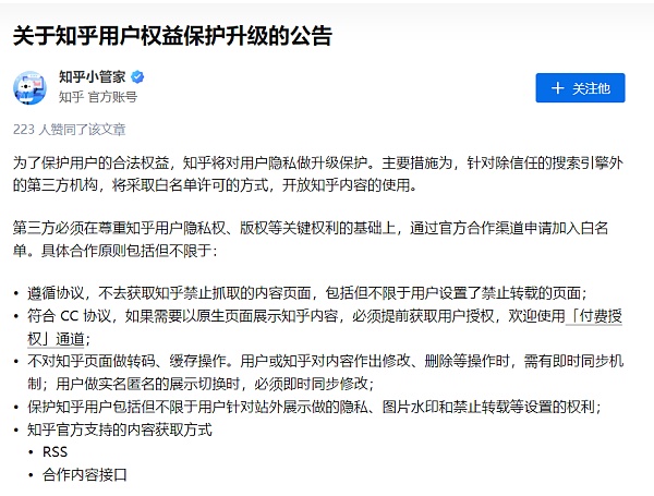 首先,知乎官方账号早在2018年就发布了《关于知乎用户权益保护升级的公告》,提到:知乎对第三方开放知乎内容的使用采取白名单制,第三方需要通过官方合作渠道进行申请。如果爬取行为违反了知乎的服务条款,知乎可能采取封禁账号、IP地址或者其他法律行动。