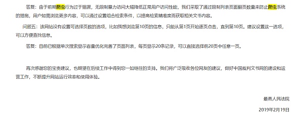 图:2019年,最高人民法院发布的《关于“中国裁判文书网”网站建设建议的答复》