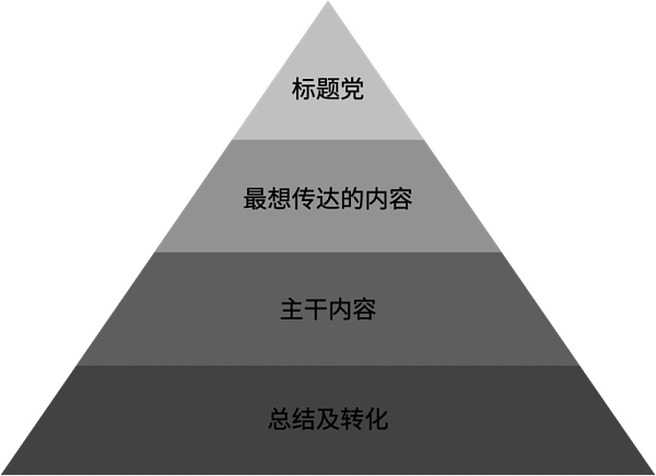 06 内容的倒金字塔结构是大多数内容写作的规则,将最重要、最吸引人的内容放在导语,将最精彩的内容放在前端,内容主体的重要性递减,上面大而重,下面小而轻,这一类结构的好处是能够让受众在最开始就了解所输出内容的重要观点,头重脚轻的结构可以帮助受众优化理解,降低受众的阅读成本,同时不影响细节的表述,并且读者在任何段落停止阅读,不影响内容主旨的传递;