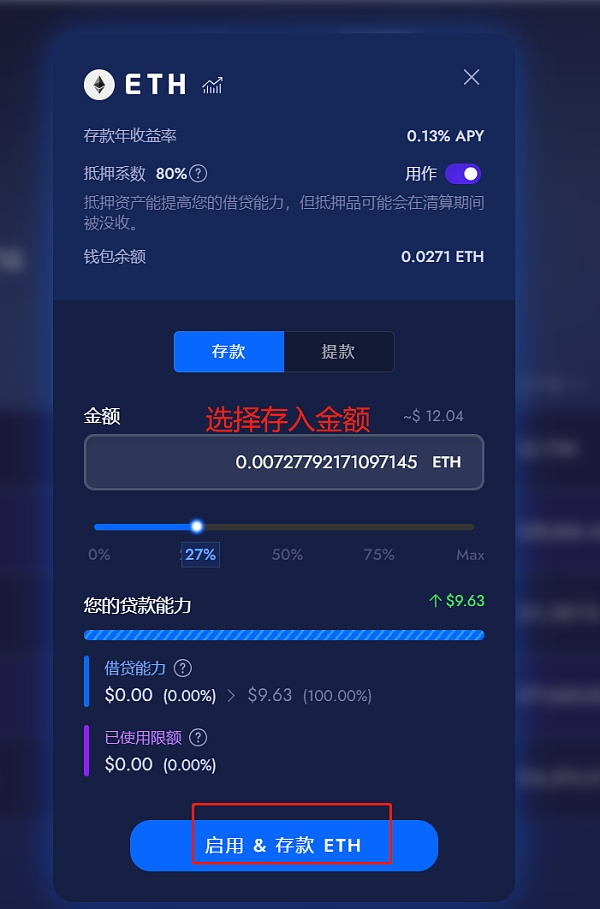 开始存款,一半存你资金的30%左右就行,然后点击红框存入