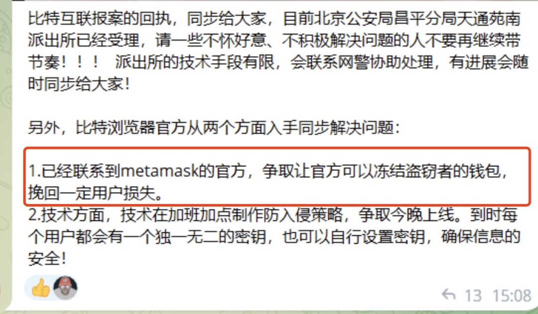 然后事件反转了,比特说自己被黑客攻击了,我们已经报an,然而这还不是最搞笑的,居然说出来联系小狐狸钱包冻结资金,我怀疑他是不是web3的从业者。被盗原因据技术猿解析是同步该窗口的扩展应用数据造成的,黑客已经获取了120e。