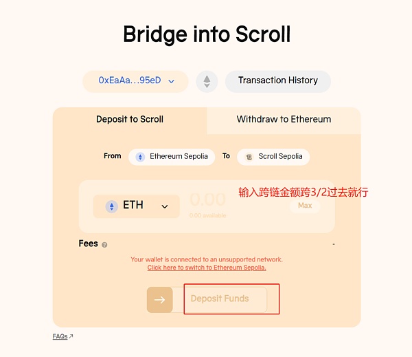 第二步跨链,点击 https://scroll.io/bridge ,连接钱包并桥接您刚刚从以太坊sepolia收到的财产到滚动sepolia。大概需要等待20分钟跨过去,点击红框钱包确认即可