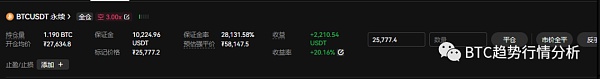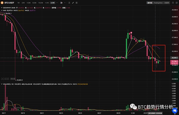 从4小时ma的价格均线来看,目前已经无力突破5ma均线并且10ma和30ma还依然在向下趋势,后续的行情还是看跌,如果今天比特币的价格无法突破站位在26000美金,那么大家可以继续做空
