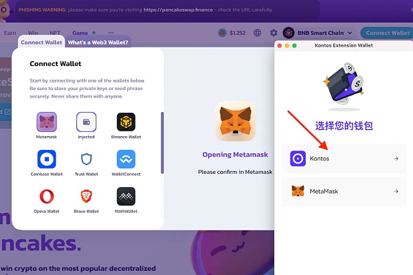 5.连接钱包(请选择BNB链)选择 MetaMask 并连接 Kontos
