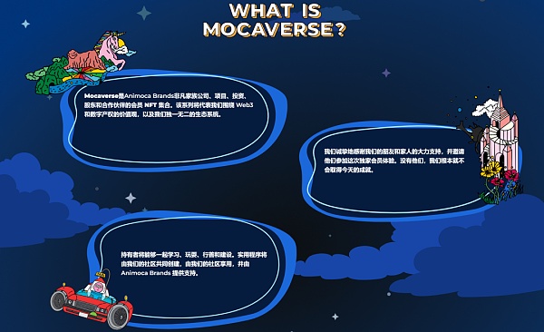 Mocaverse 是一款 Animoca Brands 旗下的元宇宙产品,Mocas 是一群大胆且具有无限创造力的生物,他们以 Mocaverse 为家。但空间扩张导致 Mocas 分离,他们之间的距离扩大了十倍。此外 Mocaverse 团队正在构建 Web3 原生工具,以增强游戏、文化和娱乐垂直领域产品的能力,允许用户创建自己的数字身份、积累声誉、赚取和消费忠诚点。