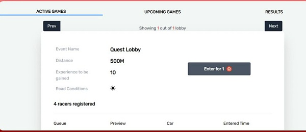 选择正在进行的比赛,然后单击“输入 1 $MASSA ” 选择您的汽车并确认交易