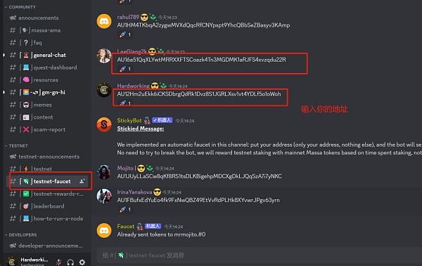 转到 testnet-faucet 频道粘贴您的钱包地址如下