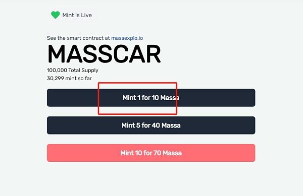 铸造一辆 Masscar NFT 前往按“铸造 1 换 10 Massa
