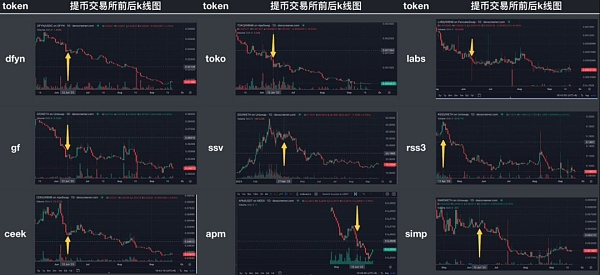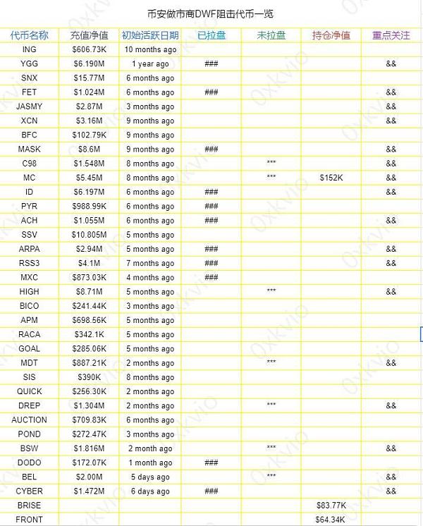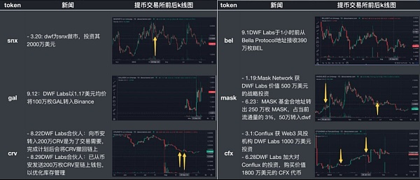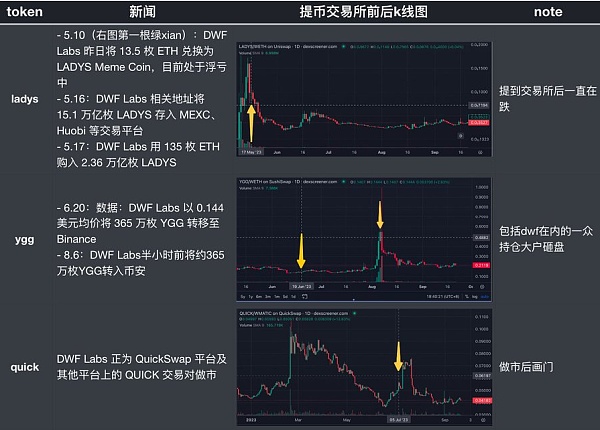 第一类是我们需要重点关注的如果看到DWF提币交易所、为某个token做市,一般这个代币就要有大行情了,结合代币当时的势能,如果这个项目正好有大利好,则会先拉再砸 例如 $YGG $cyber $Ladys $Quick $perp 等(黄色箭头为快讯时间)