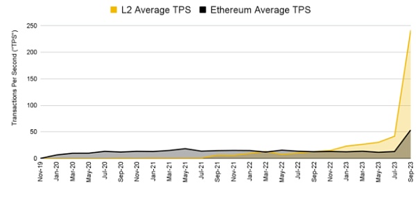 L2 Rollup的时代即将到来,以太坊 L2上的活动达到了历史最高水平。 L2的平均每秒交量(“TPS”)从 2022 年末开始超过以太坊。