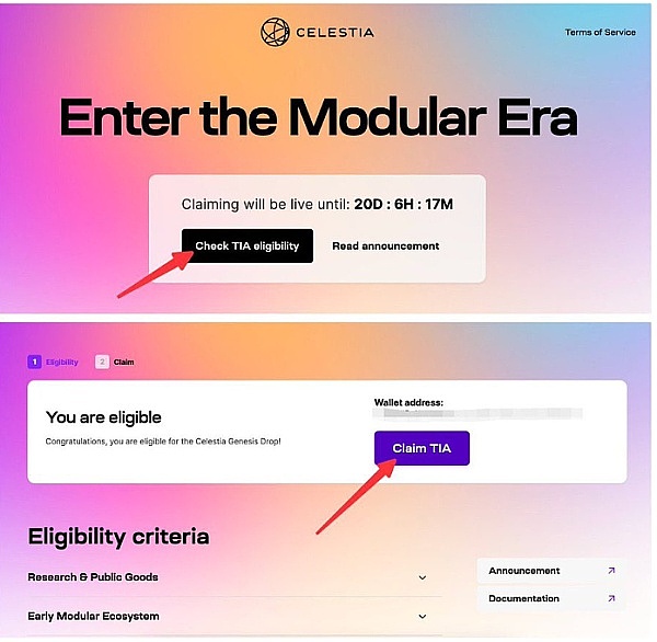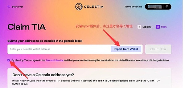 进入http://genesis.celestia.org,检查领取资格 链接小狐狸(你要check资格的钱包) 点击claim TIA