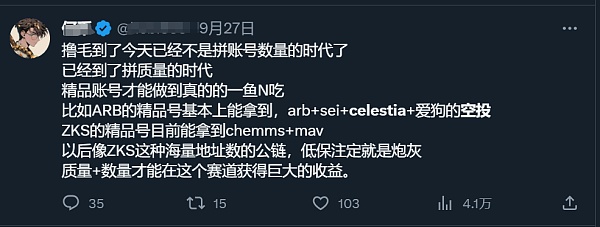 空投规则已然改变,正在从数量时代向精品时代转变,精品号在未来的空投活动中获取的激励将会越来越多,目前撸毛已经成为b圈生态中的一个重要领域,每天数万,甚至数十万撸毛地址在链上活动,带来了链上活动的繁荣,促进了行业的发展,项目方未来空投的时候可能会参考这一次Celestia的空投规则,把利益分配给行业活跃者,撸低保,没有经常参与行业的撸毛者将可能血本无归,已经能在SEI,Celestia等项目上初见端倪,目前二层上面linea的交互活动中也在向众人展示着这一方面,在银河上面做活动获取积分,带了kyc的账户参与。