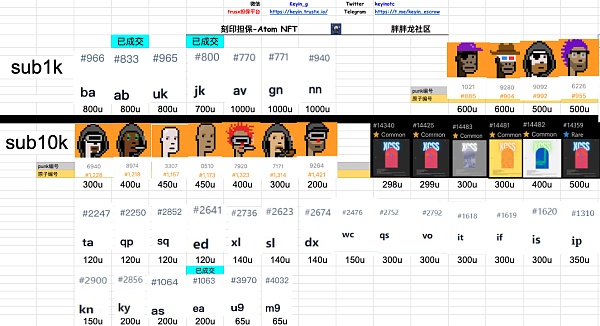 下面就是punk挂单价格,是不是很魔幻,最原始的交易方式,表格挂单法,需要哪一个就私聊管理员,谈好价格,然后交易,目前价格在300-1000u,根据稀有度来划分的。