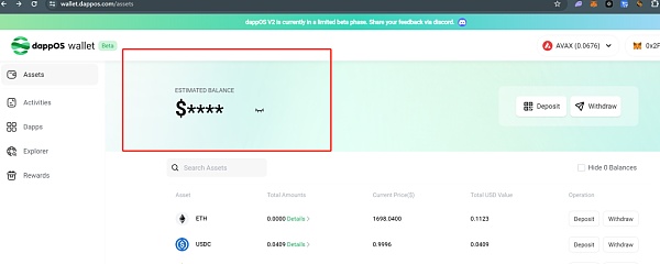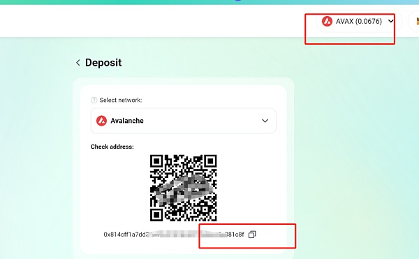 登录 https://wallet.dappos.com/ ,然后点击“Deposit”,网络选择Avalanche,将生成的地址复制到第3步的地址里。