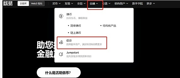 以OKX为例,首先去到 https://www.okx.com/ ,然后点击“金融 -> 借贷“