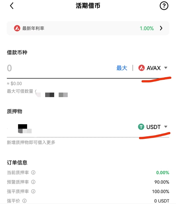 质押物可以是OKX支持的任何代币,我们推荐抵押$BTC,USDT借贷出$AVAX。