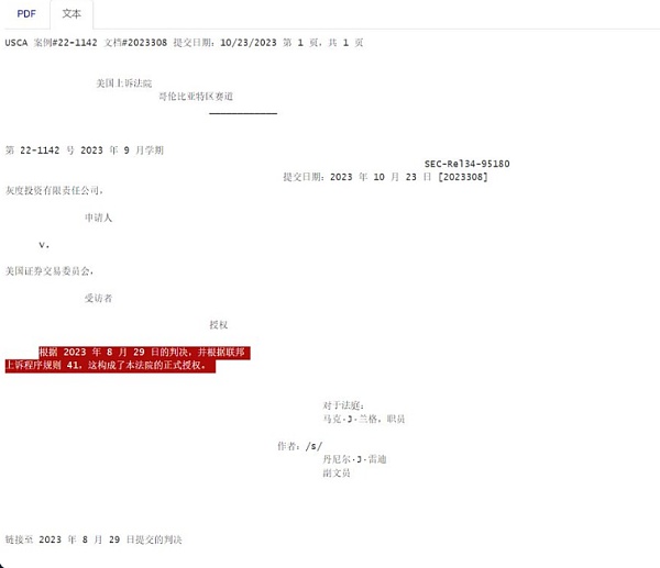 根据最新消息,特区巡回法院最终裁定结束了美国证券交易委员会(SEC)与一家资产管理公司灰度之间有关现货比特币ETF申请的纠纷,命令该机构撤回其拒绝灰度提出现货比特币ETF的申请的决定。此前,该案的初步裁定已经巩固了该判决的规定。灰度发言人Jennifer Rosenthal表示,公司期待与SEC进一步合作将灰度比特币信托基金(GBTC)转化为ETF。该公司表示,GBTC准备就绪,他们计划尽快代表其投资者采取行动。