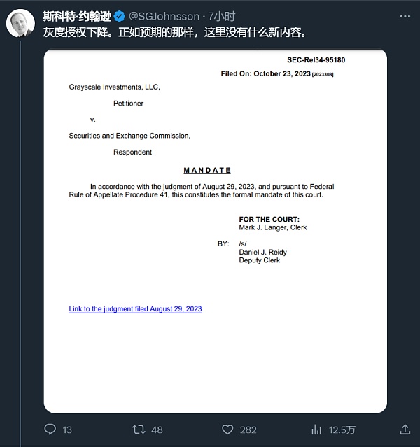 2点55分,fox 记者Emily Johnson在社交媒体上发文表示,Galleria Gallery已正式就灰度诉SEC做出最终评判。评判结果将艺术展的主题决策权交回给SEC,SEC被告知在策划灰度ETF时应采取下一步行动。