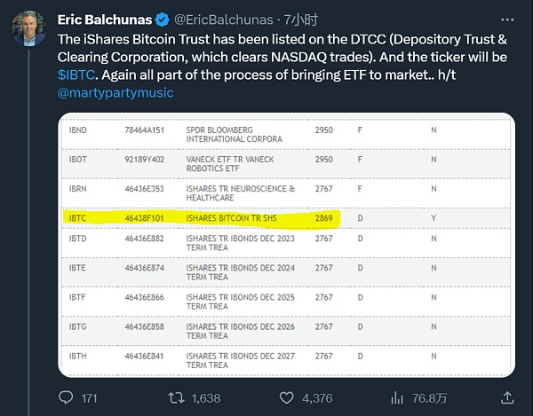 而在凌晨三点,彭博社的ETF分析师Eric Balchunas发布了一条令人瞩目的消息。他称,资产管理巨头贝莱德旗下子公司iShares比特币信托已在美国证券集中保管结算公司(DTCC)上市。该比特币信托的股票代码将是"IBTC"。这标志着推出实物比特币ETF的过程已经进入了下一个阶段。