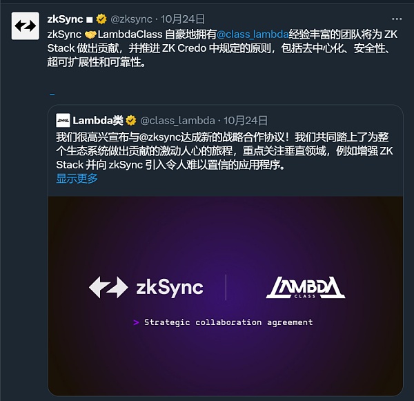 根据官方消息,LambdaClass和zkSync的合作将涵盖zkSync上的应用程序版本和堆栈改进方面的联合工作。LambdaClass的CEO Federico转发了官方发布的文案,并表示此次合作将涉及基础设施、应用和社区等多个方面。除此之外,官方并没有公布更多的合作细节,只是表示近期将会有更多项目的新动态。