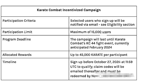 在2023年11月3日第一场活动(KC 42)之前,最多将选择15,000名用户通过电子邮件接收唯一的领取代码,以便在Karate Combat应用程序中兑换。用户可能会收到数量增加基于他们的Karma分数的奖励。