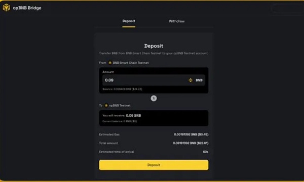 现在你已经拥有了测试网代币,接下来你需要前往https://opbnb-testnet-bridge.bnbchain.org并将它们转移到opBNB网络上。进行存款并确认交易。