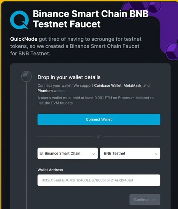 如果你准备好获得本次空投的资格了,首先要访问这些水龙头:https://testnet.bnbchain.org/faucet-smart和https://faucet.quicknode.com/binance-smart-chain/bnb-testnet来获取BINANCE的测试网代币。