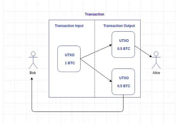 你是Bob,你有1个BTC,那么他是在一个UTXO中体现的,现在你向Alice转0.5个BTC(这里我们忽略gas fee),那么最后会生成两个UTXO,一个是你自己负责的0.5BTC的新UTXO(右下),一个是Alice负责的新UTXO(右上),原来的UTXO就不可用了。当然,如果你的输入(左边)是几个UTXO的结合(比如1BTC实际上是0.8BTC+0.2BTC的UTXO的组合),那么情况就会更复杂。