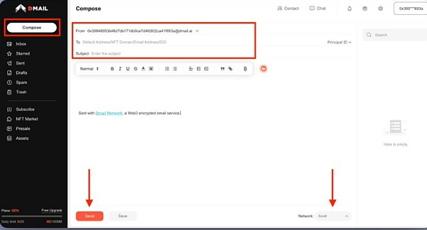 连接您的钱包 点击“撰写” 选择滚动网络 随机填写地址和主题 单击“发送”,让奇迹发生!