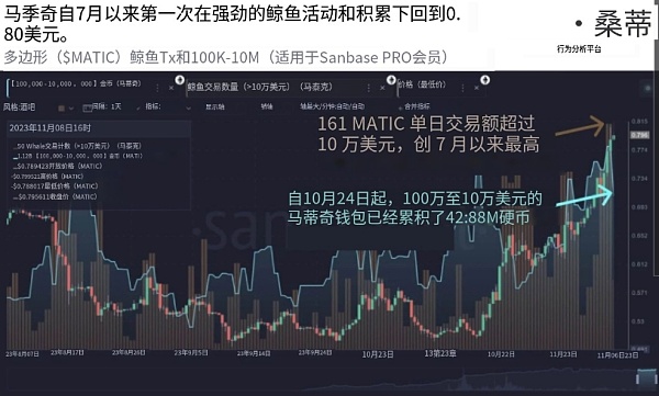 据链上数据显示,过去几周内,MATIC的鲸鱼积累量稳步增加。根据链上数据平台Santiment的数据,Polygon的MATIC市值短短三周内增长了54%,达到了0.81美元。持有10万到1000万MATIC的大型钱包地址在过去的两周内对价格上涨起到了关键作用。这种增长趋势值得我们密切关注。