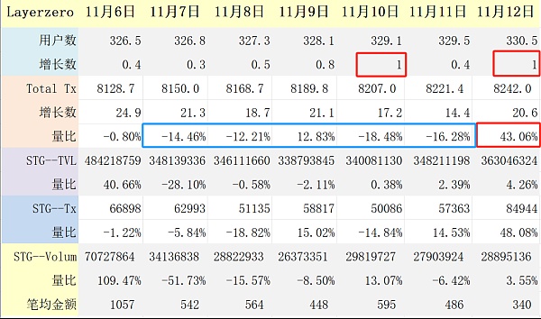 2.Stargate单日TX数异常:我们观察到在11月11日这个休息日,Stargate的单日交易数量出现了惊人的增长,达到了8.4万。这是一个非常突出的异常情况,因为在之前的几个月中,交易数量并没有接近这个水平。我们需要仔细研究这个异常现象的原因,以确定是否存在操纵交易或其他不正常的活动。