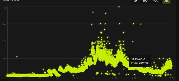 4.目前Ordinals的小图片没有其他协议的小图片与之竞争。同时,小青蛙的价格只有上一轮高点的三分之一。这表明整体溢出到小图片的资金明显不足于上一轮。