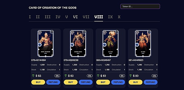 Creation Of The Gods是搭建在opBNB chain上的一款似于炉石传说的TCG卡牌对战类游戏,游戏在2023年11月底正式上线。在游戏中,用户通过在交易市场兑换NFT卡牌组建自己套牌卡组,通过PVP模式对战竞技卡牌的策略。赚取对方的卡牌以及获得经验值最终得到治理代币NOME。此外,玩家持有的卡牌会根据稀有度的不同拥有不同的牌点,不同的牌点结合游戏的棋盘放置在不同的位置可以实现攻防守固等不同的作用,游戏的卡牌支持用户使用USDT进行质押兑换,不同的卡牌需要质押的USDT数量不同,但是质押后是可以随时赎回的,并不会产生任何损耗跟手续费,游戏通过这种创新的NFT卡牌获得方式筛选掉一些对游戏毫无贡献的撸毛党,同时也通过这种机制来保障游戏中的每一张卡牌具有很好的流动性,不会出现任何一张无价值的NFT卡牌出现。用户在不进行游戏的时候,也可以把自己收藏的卡牌通过ANOME平台提供的抵押借贷协议来进行贷款,使用户即享受到NFT卡牌资产增值的权益,同时也释放资金的使用率,可以支配到其他的主流资产中去,在牛市来临之际,该套模式对用户来说可以是非常友好的体验。