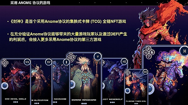 Anome将重度聚焦全链卡牌游戏,等有足够数量用户群体后,再逐渐扩充到:卡牌塔防游戏、自走棋卡牌游戏等游戏类型。目前首先接入的是一个策略TCG卡牌游戏Creation Of The Gods。该游戏由第三方游戏开发工作室负责开发,由于ANONE全程给出协议的开发技术支持与经济模型的完善,作为首发游戏获得ANOME的大力支持与流量扶持。Creation Of The Gods本身不会发行token,其游戏将完全通过与ANOME协议的联动来产生TOKEN,使用的也是ANOME协议的平台代币NOME。