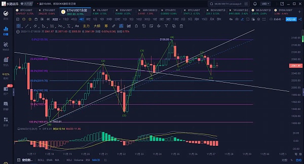 以太坊在周末两天内波动较小,未能突破前高点2137,经历了一次回踩后一直处于震荡中。昨天午盘出现涨势,但受到2095附近的压力回落,晚盘开启下跌模式,最低跌至2036附近并得到支撑反弹至2080,目前行情在2065附近继续震荡。