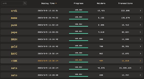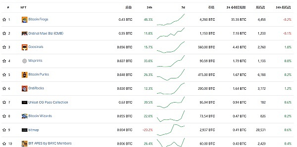 通过上文对铭文的描述我们知道,当隔离见证中的信息为文本、图像、音乐、视频时,便会形成独一无二的“聪”,此时的“聪”便称为比特币NFT;如果隔离见证中的信息为铸造同质化代币的铸币脚本时,便可形成带有铸币性质的“聪”,此时的“聪”便称为BRC-20代币。在比特币生态中,大部分的NFT和BRC-20代币是通过Ordinals协议铸造的,截止当前时间,比特币NFT有Bitcoin Frogs、Ordinal Maxi Biz、Goosinals等,具有交易量的NFT总市值约为2050万美元;BRC-20代币有$ORDI、$MEME、$PUNK等,总市值约为50亿美元。