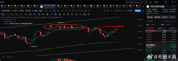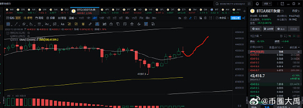现货比特币ETF可能在2024年获得批准,这可能会改变人们对数字资产的看法,此前一年该行业面临着强烈反对。2024年,有两个可能的发展引人注目。首先,美国证券交易委员会批准现货比特币ETF可能会激发对数字资产的更多兴奋和支持,澄清监管不确定性和估值担忧。 其次,推动美国资本市场基础设施现代化符合数字一代对效率和透明度的需求。即将到来的T+1贸易结算截止日期等举措以及贝莱德首席执行官Larry Fink对代币经济驱动的市场未来的预测都强调了这一趋势。预计到2024年,对旨在实现这一改革的用例的机构支持将会增加,例如Figure对Provenance区块链的使用。技术面日线:48000目标不变,上行通道未变四小时线:这笔在上行到43800遇到了小级别的阻力,应当会回调至43000盘整一波,再继续向上冲15分钟线:盘整,能回调到43000上下两百刀就上车多单操作计划:42300多单继续持有