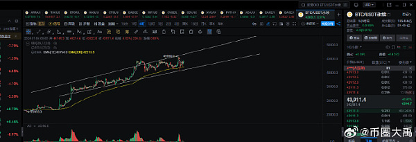 2024.1.6静静等待拉盘昨晚美国12月非农就业人口增加21.6万人超预期,失业率3.7%低于预期,时薪年率4.1%加速增长。数据发布后与美联储会期挂钩的互换合约显示,3月降息25个基点的可能性略低于50%,这低于稍早的60%。同时美债收益率大幅反弹但这只持续了2个小时不到,开盘后美股就开始反弹,同步的3月美联储降息25个基点的预期也反弹回了60%而美债殖利率曲线开始从长天期开始反弹,并在3年期已经出现交叉技术面日线:上行通道未破,依旧还是看上行,48000目标不变,时间上来算的话,差不多是在本月中附近能到达四小时线:目前42000为支撑,ETH的话是昨天的2170为支撑,一直没接到十五分钟线:二探完成,清的差不多了,上行吧操作计划:42500多单持有,现货拿着等