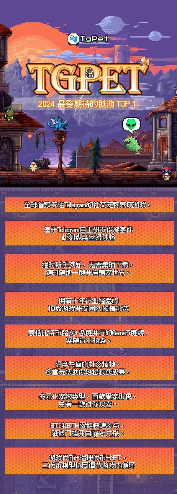 通过官方推特和官网的信息,大致上了解一下这款游戏整体的情况。TgPet 是一个创新型的社交宠物养成游戏,由全球首个专注于Telegram的链游发行平台孵化。游戏结合了区块链技术的先进性,为玩家在一个充满活力、互动无限的虚拟宇宙中,提供了一种全新的宠物养成体验。官方宣称它不仅是一款宠物游戏,更是创新的经济系统设计,以及Telegram高效而顺畅的分享网络,为玩家提供了一个独特的互动体验和资产管理机制,目前对该项目的几个亮点做一个阐述。
