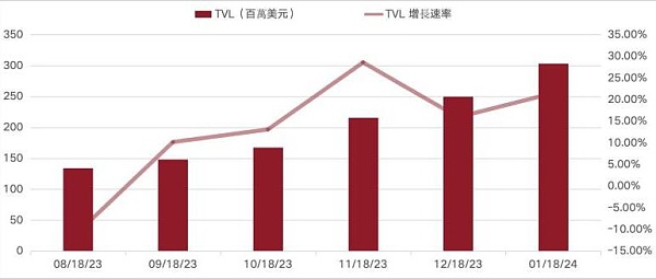 从 2024 年 8月12 日到 2024 年1月12 日,Pendle的 TVL 从1.4 亿美金增长到 3.1 亿美金,月复合增长率达到18.6%。