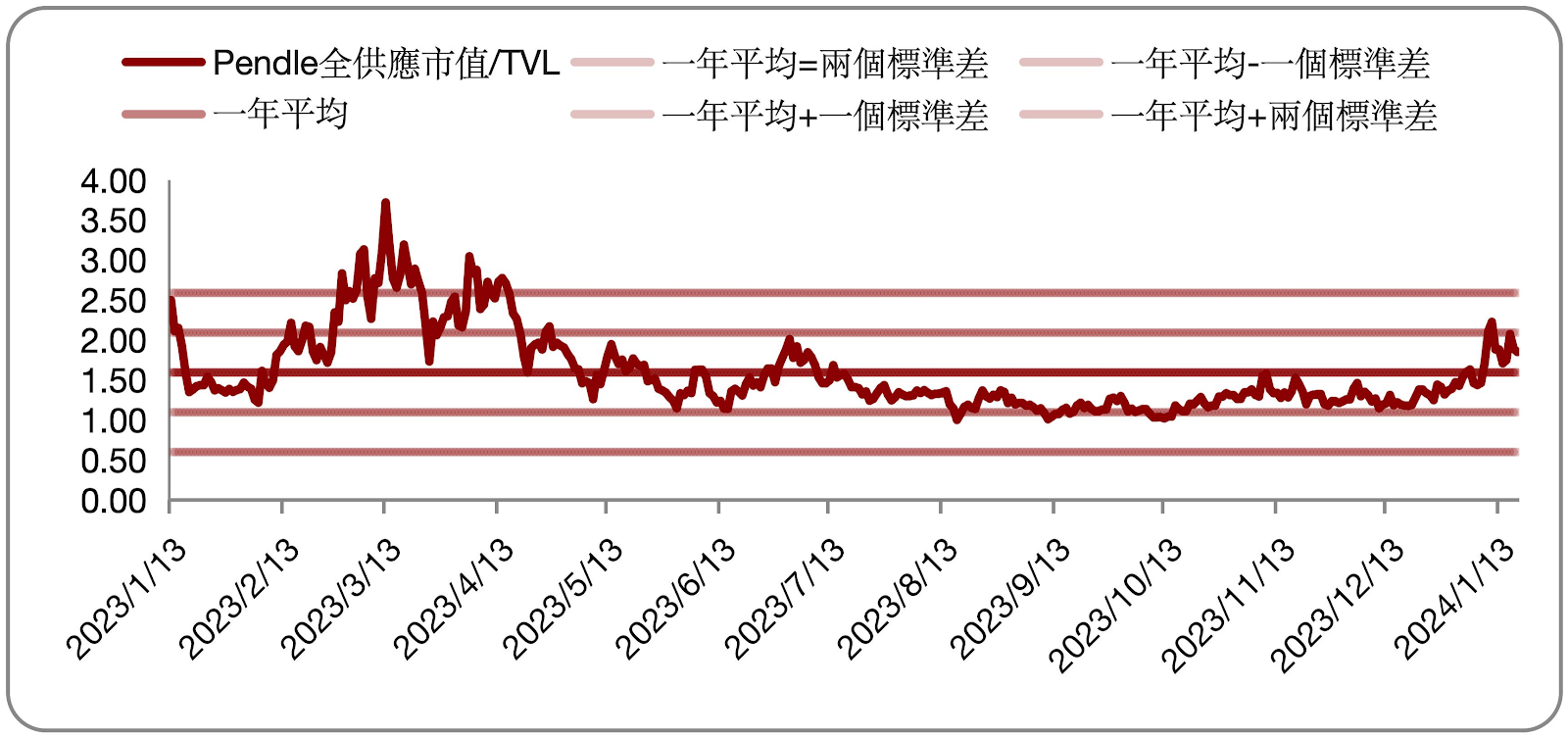 进一步分析比较过去一年Pendle的全供应市值与 TVL比例可以发现均值在 1.59 位置,而目前 1.85 的估值水平与一年平均相若,低于平均加上一个标准差 2 倍的水平,相比 2023 年 3月 2.5 倍的估值相对理性。