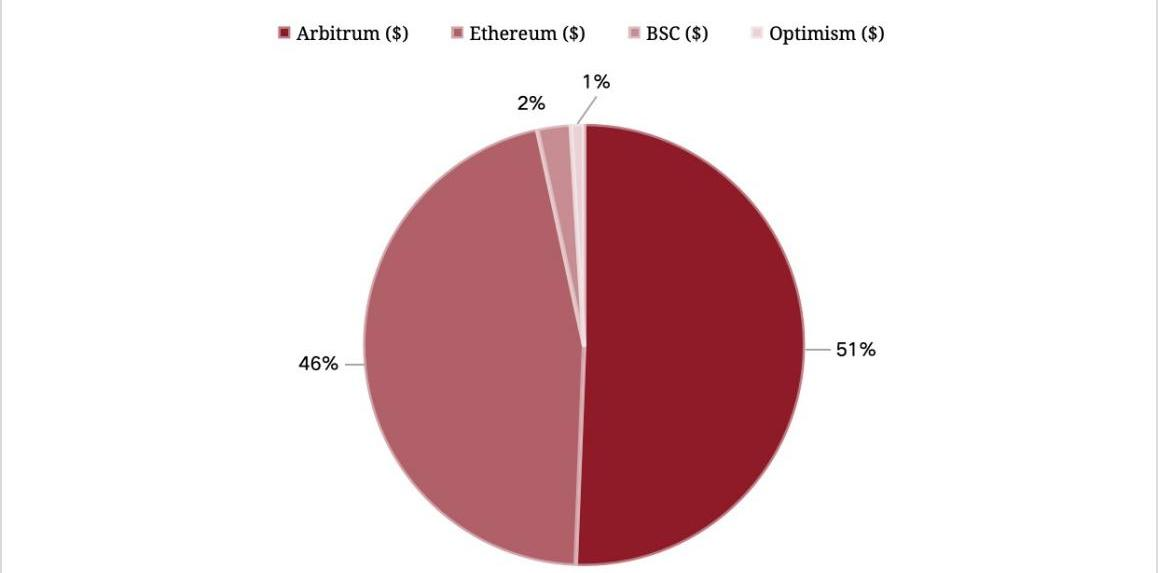 截止到 2024 年 1月,Pendle已经部署在 Ethereum,Arbitrum,BSC和 Optimism链上。2023 年8 月至2023年 1 月,在Ethereum和Optimism发生的交易量占据了Pendle总交易量的 97%。